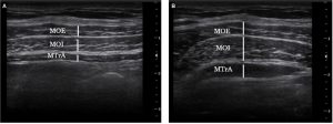 MOE: músculo oblicuo externo, MOI: músculo oblícuo interno, MTrA: músculo transverso del abdomen.