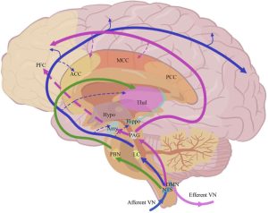 En definitiva, aplicando un estímulo eléctrico en el oído externo se buscan activar las fibras aferentes del nervio vago, las cuáles hipotéticamente transmitirían la señal hasta el núcleo del tracto solitario (NTS), el principal centro de relevo para la información vagal en el tronco encefálico. La “cascada” neurofisiológica que se esperaría tras la activación del NTS sería la estimulación del Locus Coeruleus (LC), que resultaría en una producción de norepinefrina (NE), que a su vez estimularía el Núcleo Dorsal del Rafe (DRN, por sus siglas en inglés) para liberar serotonina (5-HT), y todo ello se asociaría con una mayor plasticidad sináptica y neurogénesis.