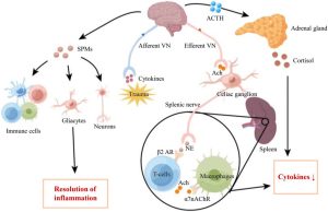 Ach: acetilcolina; ACTH: hormona adrenocorticotropa; NE: norepinefrina; SPMs: mediadores pro-resolutivos especializados; VN: nervio vago; β2 AR: β2 receptor adrenérgico; α7nAChR: α7 receptor nicotínico ACh; HPAA, eje hipotálamo-pituitario-adrenal.