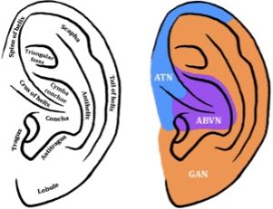 ATN: nervio auriculotemporal; GAN: nervio auricular mayor; ABVN: rama auricular del nervio vago